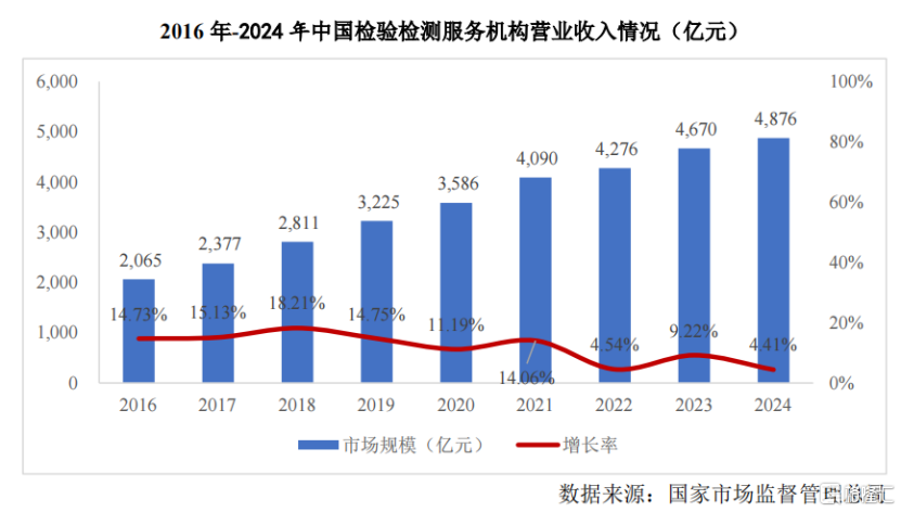 2016年至2024年,我国检验检测行业市场规模从2065亿元增长到4876亿元,复合增长率为11.34%;2024年行业市场规模4876亿元,同比增长4.41%。近年来,虽然检验检测行业整体呈现规模持续增长,但增速有所放缓。