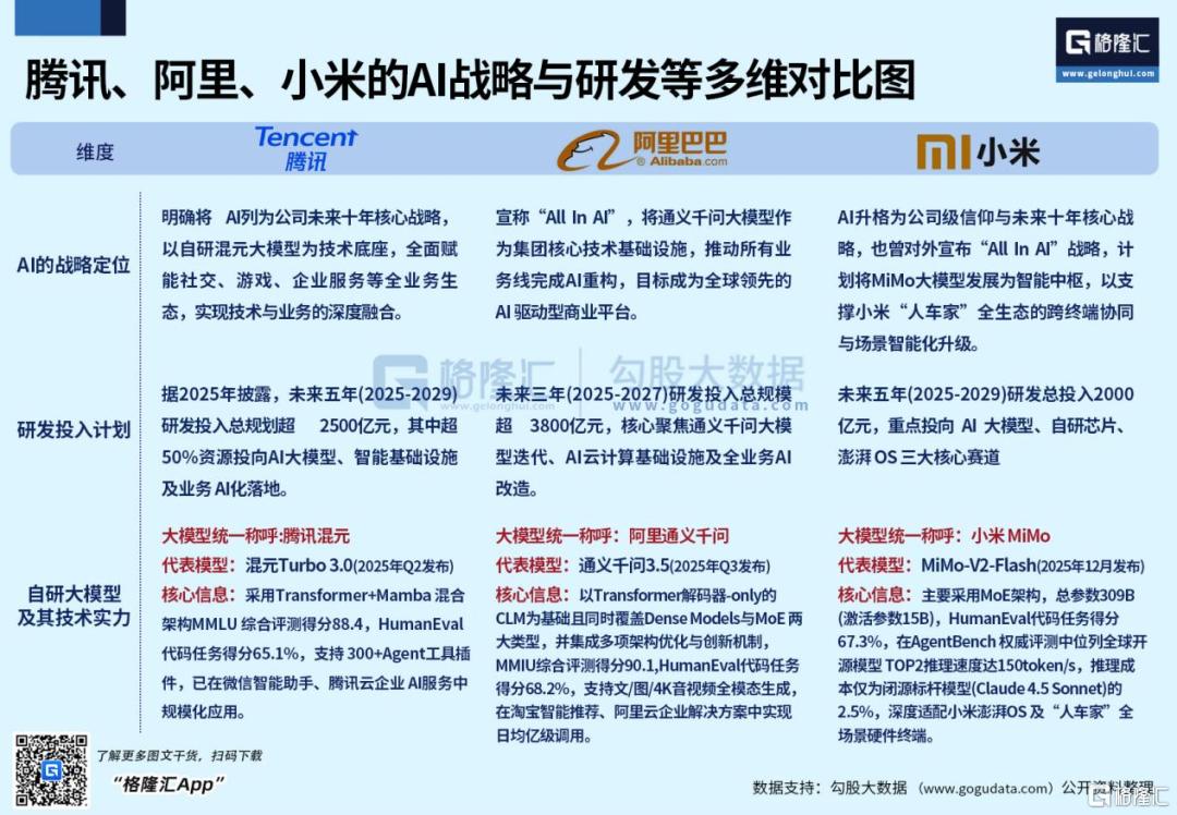 从阿里、腾讯、小米等国内头部科技公司在AI战略、研发投入和技术实力的综合情况来看,可以说目前它们已站基本在同一起跑线了。