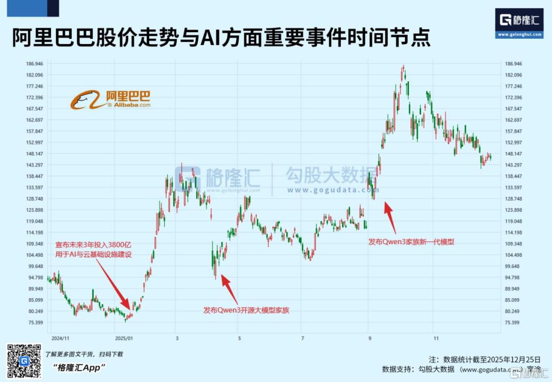阿里全年股价大涨超80%,核心得益于AI+云的战略落地与业绩兑现:通义千问开源生态与模型能力持续突破、AI相关收入连续多季度三位数增长,叠加阿里云增速回升与算力基建加码,推动市场对其估值预期强烈看好。