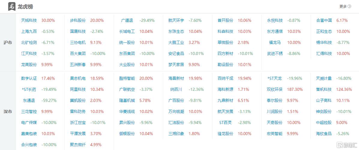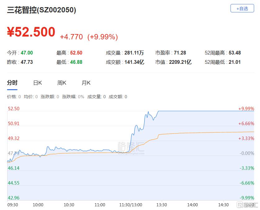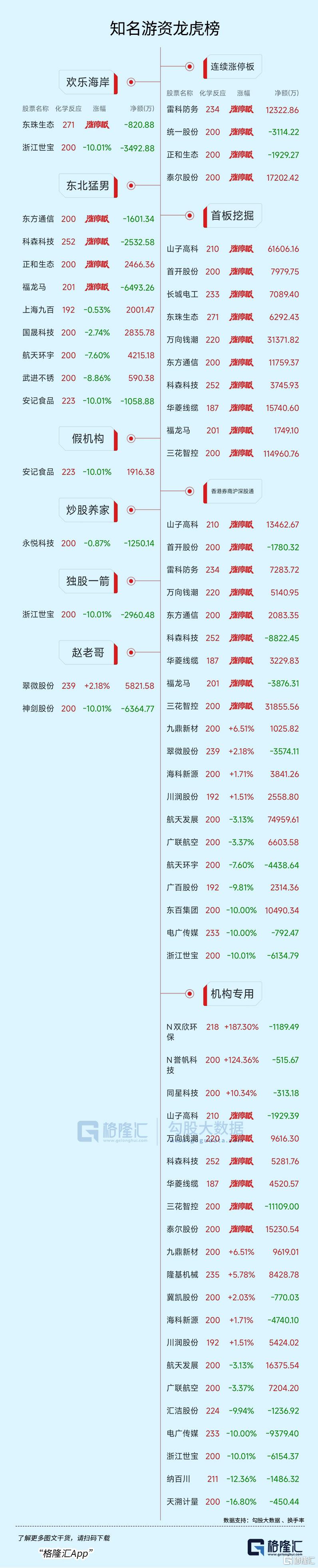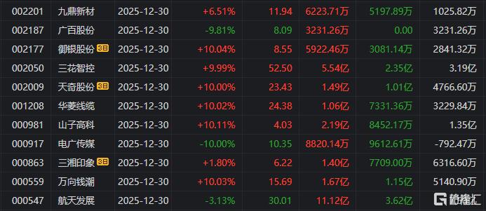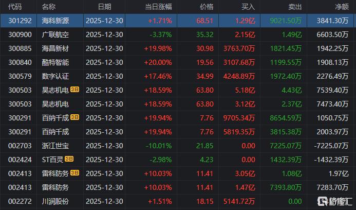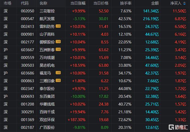 龙虎榜单日净买入额前三为三花智控、航天发展、山子高科,分别为11.5亿元、6.87亿元、6.16亿元。