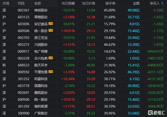 龙虎榜单日净卖出额前三为神剑股份、翠微股份、浙江世宝,分别为5.1亿元、1.65亿元、1.15亿元。