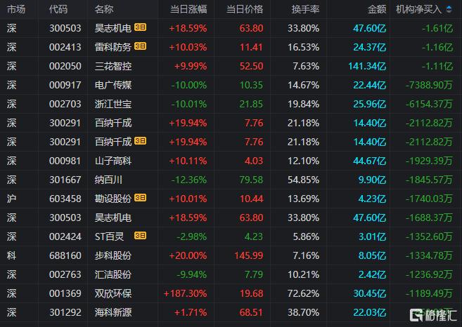龙虎榜中涉及机构专用席位的个股中,当日净卖出额前三为三花智控、电广传媒、浙江世宝,分别为1.11亿元、7388.9万元、6154.37万元。