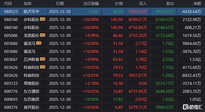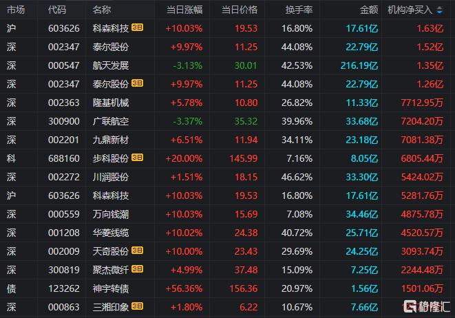 龙虎榜中涉及机构专用席位的个股中,当日净买入额前三为泰尔股份、航天发展、隆基机械,分别为1.52亿元、1.35亿元、7712.95万元。