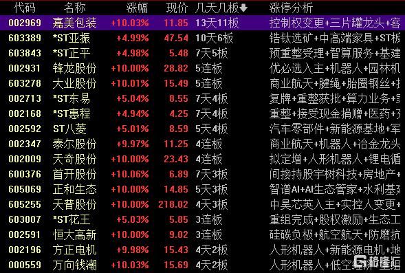 高位股方面,实控人变更的嘉美包装13天11板、锋龙股份5连板,机器人概念股大业股份5连板、天奇股份4连板、泰尔股份4连板。