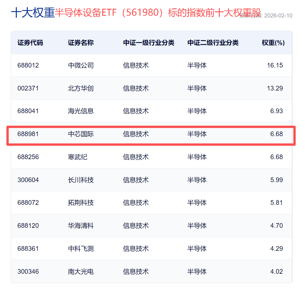 数据显示,中芯国际为中证半导第四大权重股,权重占比约7%。