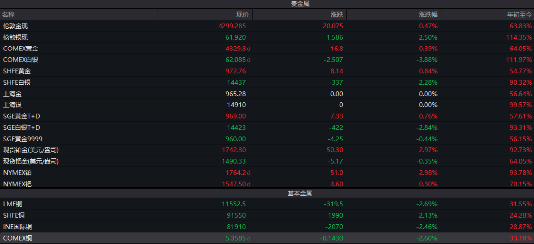 不仅如此,昨晚黄金、白银、铜等期货也跳水,COMEX黄金在两个小时内短线跳水超100美元,最终报收4329.8美元/盎司。COMEX白银一度大跌5.5%,最终报跌3.88%,LME铜也大跌2.69%。
