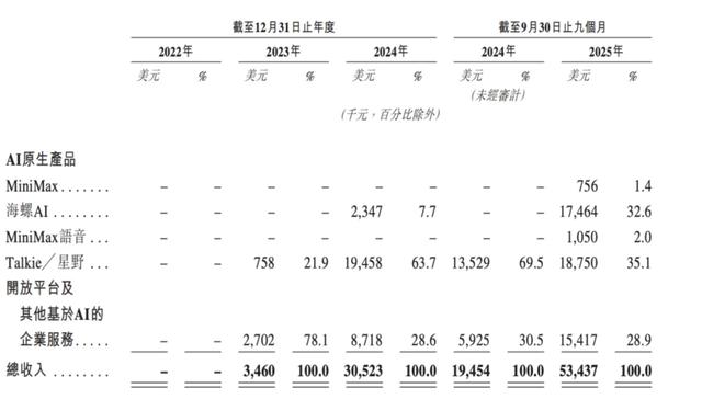 因为成立时间较晚,MiniMax直到2023年才开启商业化,到2024年营收来到了3052万美元,2025年前9个月,MiniMax的营收总额来到了5343.7万美元,同比增长174.68%,呈现了爆发式增长。