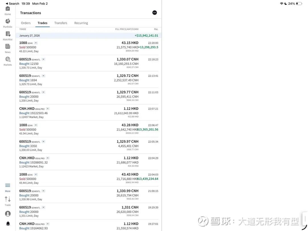 从段永平晒出的交易记录来看,1月27日,他卖出中国神华港股150万股,合计近6500万港元。同日,段永平多次买入贵州茅台,合计买入7.72万股,耗资约1.03亿元。
