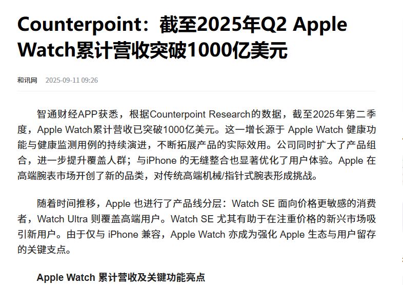 截至2023年中期,Apple Watch累计销量为2.293亿块,仅次于iPhone、iPad和AirPods,根据Counterpoint Research的数据,截至2025年第二季度,Apple Watch累计营收已突破1000亿美元,成为苹果第四畅销产品;