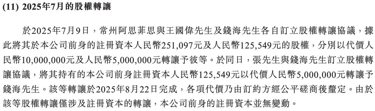 另在2025年7月,常州阿思菲思向王国伟、钱海转让了所持持微亿智造的部分股权,分别作价1000万元、500万元。同期,微亿智造董事长张志琦向钱海转让所持股权,作价500万元。