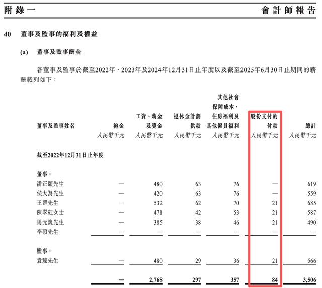 对比发现,微亿智造披露的信息存在前后不一致的情形。与之对应的是,招股书中会计师报告板块“附录一”中关于董事及监事酬金的部分,则显示该公司2022年对董事产生“股份支付的付款”合计约为8.4万元,和前述内容同样存在较大差异。