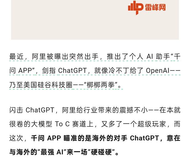 而阿里千问作为一款大厂推出的应用,业内不少的评价却明显与上述这家企业不同,在他们看来,阿里是善于解决问题的。据雷锋网消息,千问APP 瞄准的是海外的对手 ChatGPT,意在与海外的“最强 AI”来一场“硬碰硬”。
