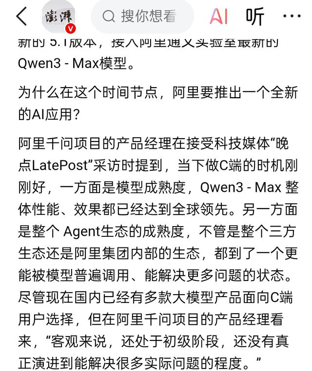 据澎湃新闻,阿里千问项目的产品经理在接受科技媒体“晚点LatePost”采访时对这个原因做了非常详细的解答,当下做C端的时机刚刚好,一方面是模型成熟度,Qwen3 - Max 整体性能、效果都已经达到全球领先。