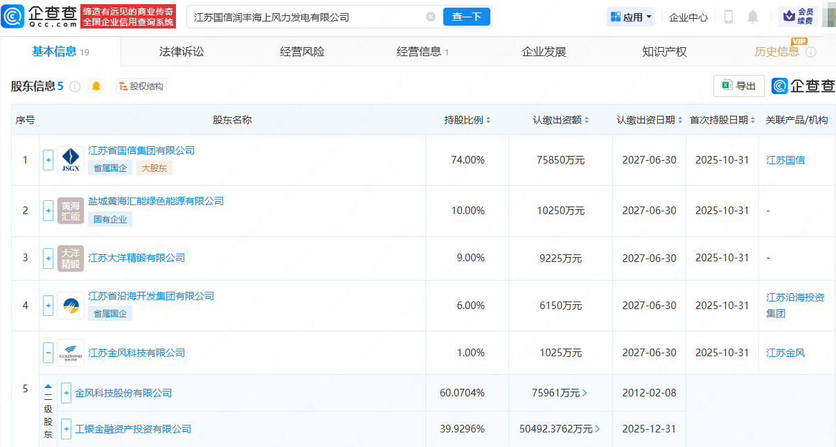 企查查APP显示,近日,江苏国信润丰海上风力发电有限公司成立,法定代表人为李保洋,注册资本为10.25亿元,经营范围包含:发电业务、输电业务、供(配)电业务。企查查股权穿透显示,该公司由江苏省国信集团有限公司、金风科技(002202)旗下江苏金风科技有限公司等共同持股。