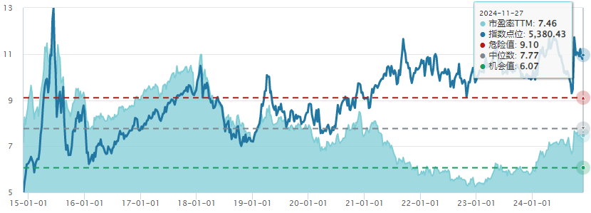目前,中证红利指数(000922.CSI)的估值已低于历史平均水平,跟踪该指数的中证红利ETF(515080)或已迎来配置良机。根据Wind数据,截至2024.11.27,中证红利指数(000922.CSI)的市盈率TTM为7.46,而历史市盈率TTM中位数为7.77,处于较为安全的区间。