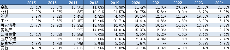 近年来中证红利指数(000922.CSI)权重行业占比统计表