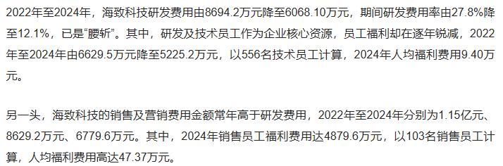 其次,在AI这个技术驱动型行业,其研发费用不增反降,从2022年的8694万元持续下滑至2024年的6068万元,研发费用率从27.8%腰斩至12.1%。与此形成鲜明对比的是,2024年销售人员的平均福利是研发技术人员的5倍。这种“重销售、轻研发”的投入结构,与其所讲述的技术驱动故事存在明显偏差,令人对其长期技术护城河的加深产生疑虑。