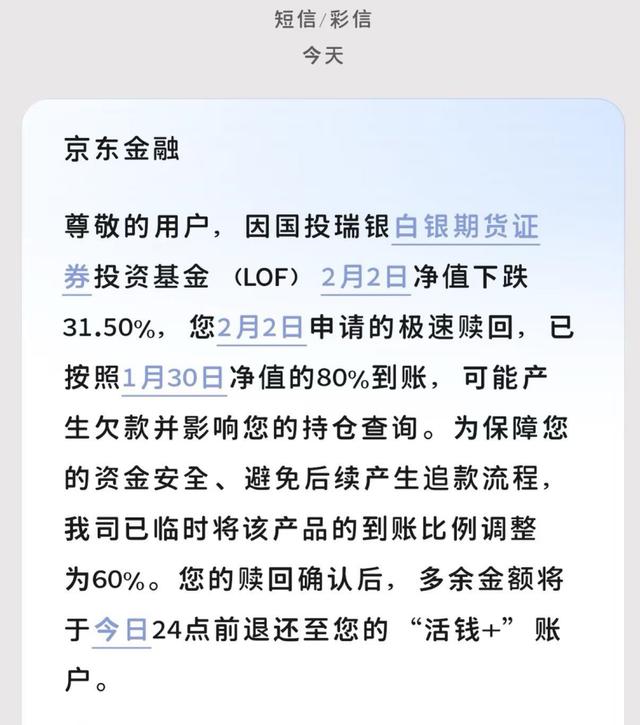 京东金融在事后向用户发送的短信中解释:“因国投瑞银白银期货证券投资基金(LOF)2月2日净值下跌31.50%,您2月2日申请的极速赎回,已按照1月30日净值的80%到账,可能产生欠款并影响您的持仓查询。为保障您的资金安全、避免后续产生追款流程,我司已临时将该产品的到账比例调整为60%。”