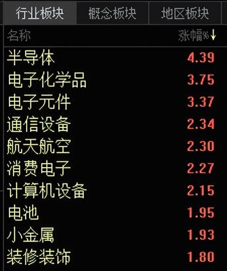 行业涨幅前五名,全是“新质生产力”的代表:半导体,电子化学品,电子元件,通信设备,航天航空。半导体行业当日大涨4.39%,可谓独占鳌头。