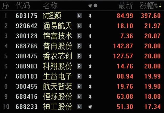 京沪深个股涨幅榜前10中,包括当天上市的新股超颖电子,全都是科技股,最低涨幅也高达17.34%。