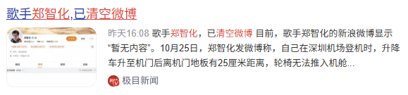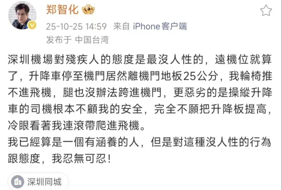 10月25日,郑智化发了一条微博,吐槽深圳机场对残疾人态度“没人性”,升降车和机门有着25公分的高度差,自己坐着轮椅根本推不进去。自己“连滚带爬”进飞机。