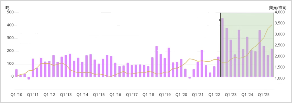 2025年4月底之前的那一轮金价狂飙,主要推动力来自全球央行的持续购金行为。数据显示,仅中国央行在2025年前四个月累计增持黄金48万盎司,而随后六个月的增持速度有所放缓,累计增持32万盎司。