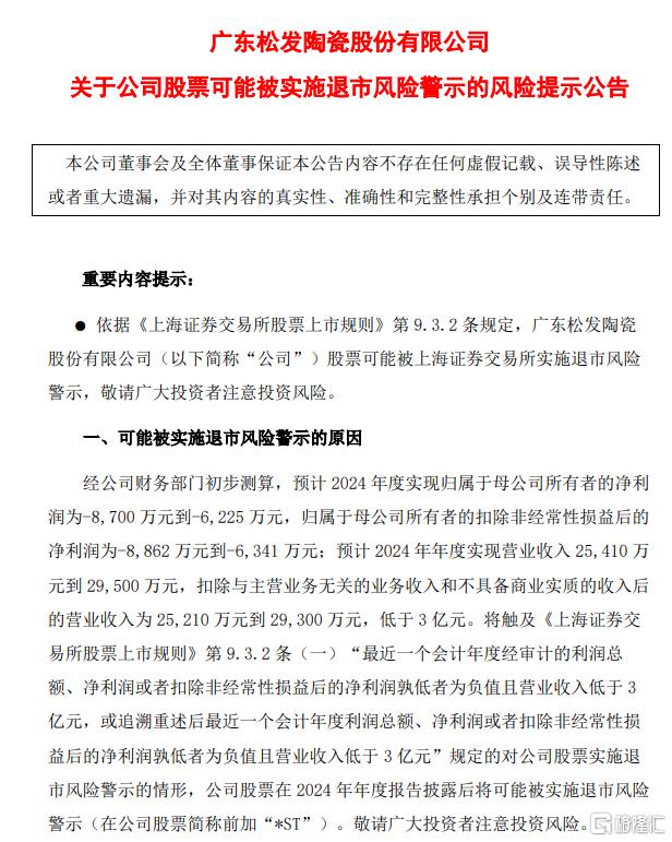 根据上交所规定,松发股份可能在2024年年报正式披露后因业绩不达标被实施退市警示,公司股票将被冠以*ST的字样。