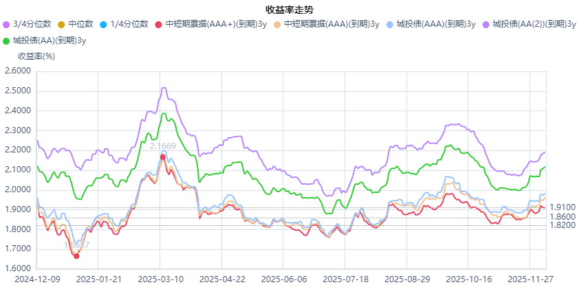 截至12月8日当日收盘,利率债收益率呈现短端平稳、长端小幅上行的格局。按照中债估值曲线来看,1年期国债收益率在1.4014%附近,变化较小,3年期国债收益率反而下行0.5bp至1.4014%,反映出市场对短期流动性宽松的预期稳固;而10年期国债收益率上行0.2bp至1.8499%,30年期国债收益率上行至2.2577%,超长端利率近期波动加剧,主要源于对财政发力、经济“开门红”、股市年初日历效应的提前博弈。从机构行为看,当前银行、险资等配置盘更倾向于增持3-5年期中短端利率债,而交易盘对超长债的持仓较为谨慎,导致利差转向陡峭化。