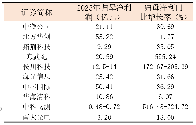 截至最新,半导体设备ETF招商(561980)前十大权重股均已披露2025年业绩报告或快报,寒武纪、长川科技、中科飞测等多家公司实现全年归母净利润同比大幅增长。