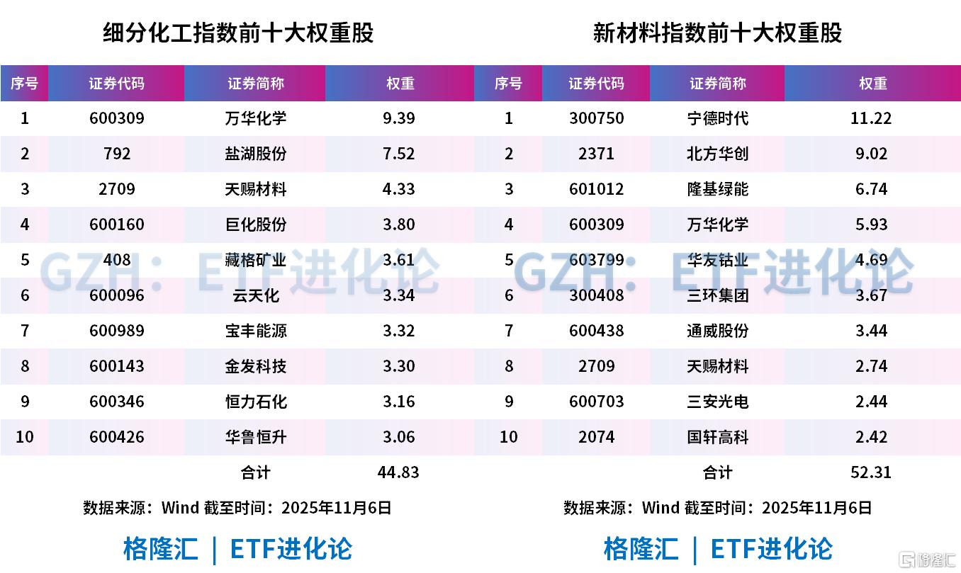 官网显示,化学制品等行业归为细分化工主题;而中证新材料主题指数选取50只业务涉及先进钢铁、有色金属、化工、无机非金属等基础材料以及关键战略材料等新材料领域的上市公司证券作为指数样本,以反映新材料主题上市公司证券的整体表现。