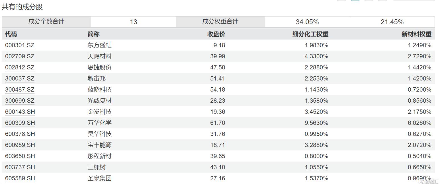 两者共有的成份股有13只个股,分别是天赐材料、东方盛虹、恩捷股份、新宙邦等。