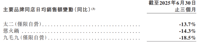 今年上半年,太二经营指标仍不理想,直营店的翻台率由上年同期的3.8次/天下降至3.1次/天,同店销售额同比下降19%。与此同时,太二扩张节奏自2024年起显著放缓,2023年、2024年,太二门店规模分别净增长128间、56间,今年上半年的门店数量则净减少65间,九毛九解释称,太二上半年收入承压与其报告期内门店规模大幅缩减以及同店销售不振有关。