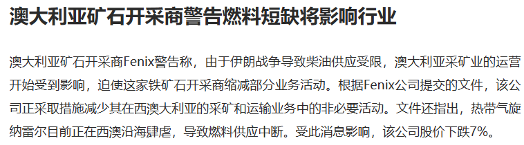 据报道,澳大利亚矿石开采商Fenix警告称,由于伊朗战争导致柴油供应受限,澳大利亚采矿业的运营开始受到影响,迫使这家铁矿石开采商缩减部分业务活动。澳洲采矿业(包含铁矿、煤炭、黄金、锂矿等)柴油需求占该国30%,目前库存约半个月到1个月,且从产值规模和重要性来说,锂矿的保供排序相对靠后,短期澳矿生产或受较大影响。
