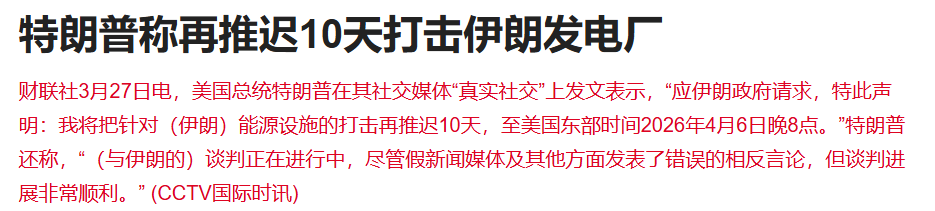 昨晚美国总统特朗普在其社交媒体“真实社交”上发文表示,“应伊朗政府请求,特此声明:我将把针对(伊朗)能源设施的打击再推迟10天,至美国东部时间2026年4月6日晚8点。