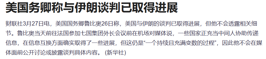 据报道,美国国务卿鲁比奥26日称,美国与伊朗的谈判已取得进展,但他不会透露相关细节。