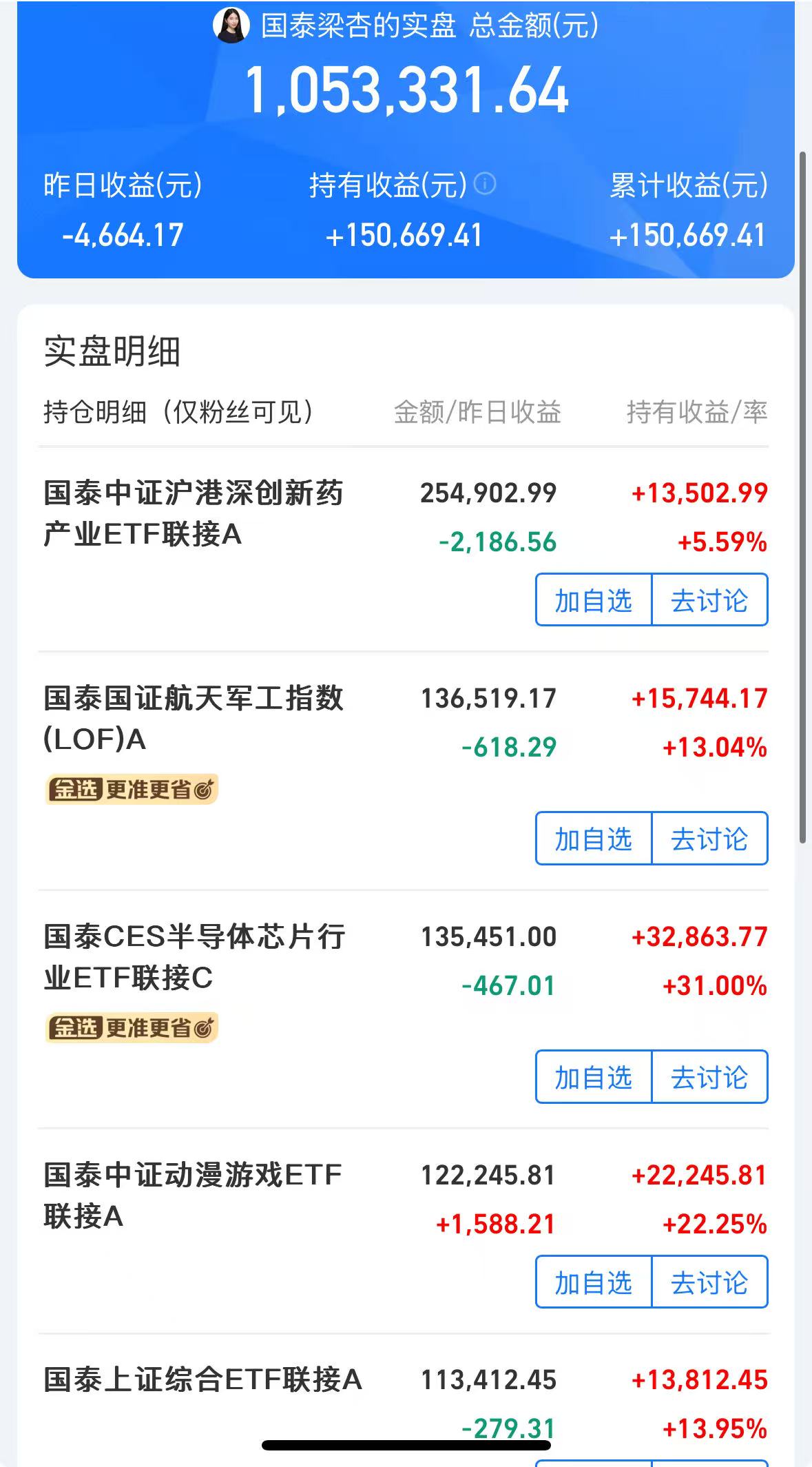 截至2025年3月13日,梁杏基金实盘总金额105.33万元,其中累计收益15.07万元,持有的ETF均实现盈利。