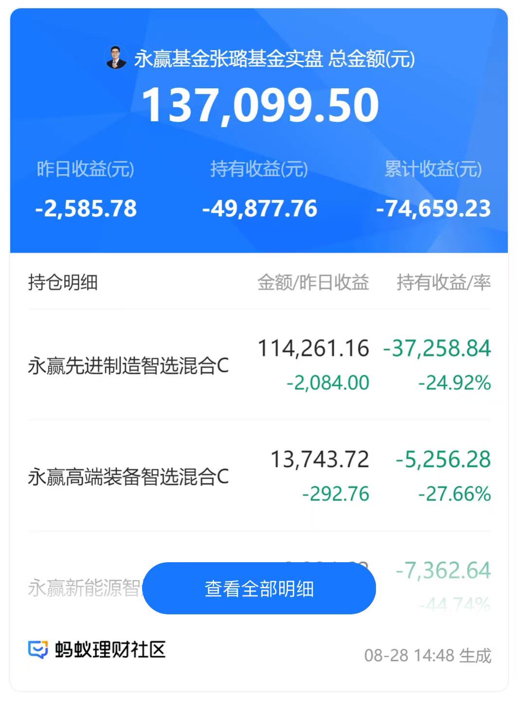 实盘业绩最差时,张璐实盘资金只有不到14万元。2024年8月发布的笔记中,张璐实盘总金额约13.71万元,其中永赢先进制造智选混合C、永赢高端装备智选混合C回撤均超过20个百分点,累计亏损了约7.47万元。