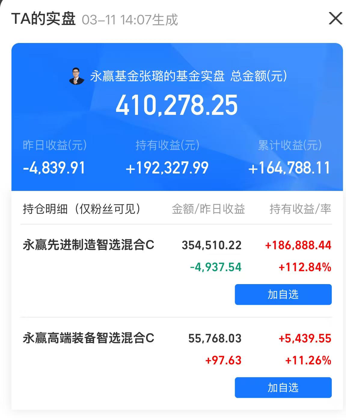 实盘内容显示,张璐通过定投方式累计投入21万元购买自己管理的基金,截至2025年3月11日,总收益突破16万元,其中永赢先进制造智选混合C的持有期收益率超过112%。