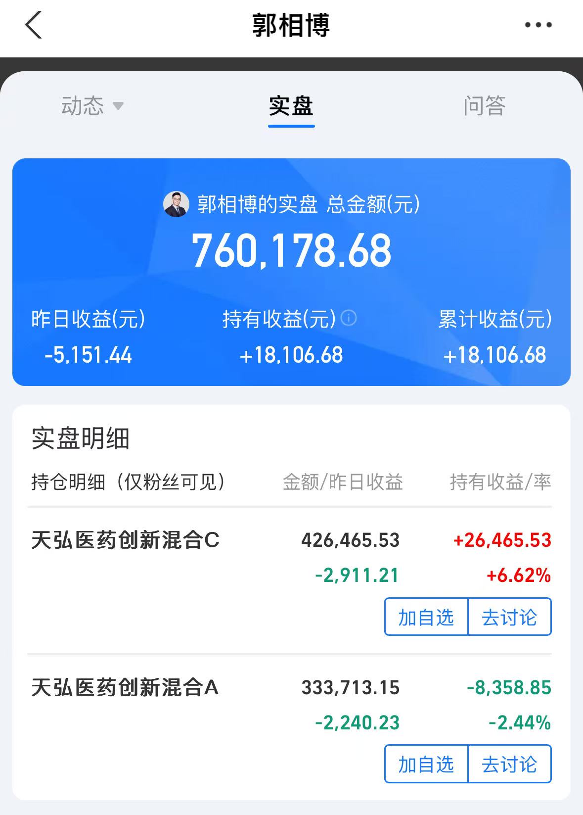 不过,最近几个月郭相博重新增持了医药基金,在其目前披露的实盘中新增买入了约40万元天弘医药创新混合C,截至2025年3月13日,持有期收益率达到6.62%。