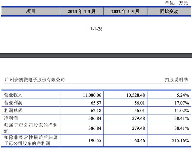 另据招股书披露,安凯微2023年第一季度的营收为1.11亿元,较2022年同期的1.05亿元增长5.24%;净利润为386.84万元,2022年同期的净利润为279.48万元;扣非后净利润190.55万元,2022年同期的扣非后净利润为60.46万元。
