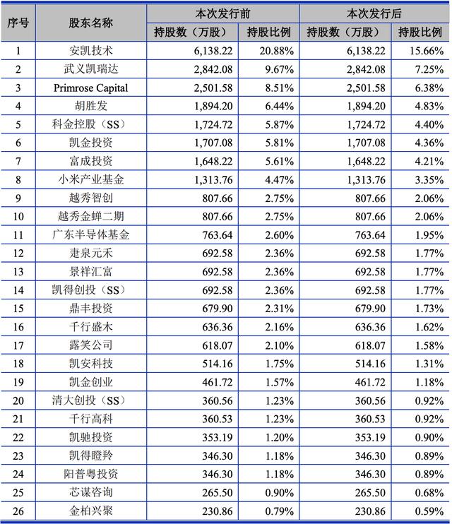 其中,胡胜发直接持股6.44%,也是安凯微董事长兼总经理。另外,科金控股(SS)持股5.87%,凯金投资持股5.81%,富成投资持股5.61%,小米产业基金持股4.47%,越秀智创、越秀金蝉二期均分别持股为2.75%。