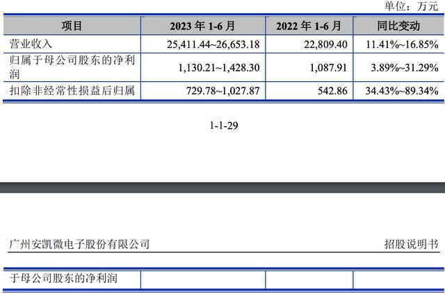 同时,安凯微预计该公司2023年上半年的收入约为2.54亿元至2.67亿元,同比增长11.41%至16.85%;归母净利润1130.21万元至1428.30万元,同比增长3.89%至31.29%;扣非后净利润729.78万元至1027.87万元,同比增长34.43%至89.34%。