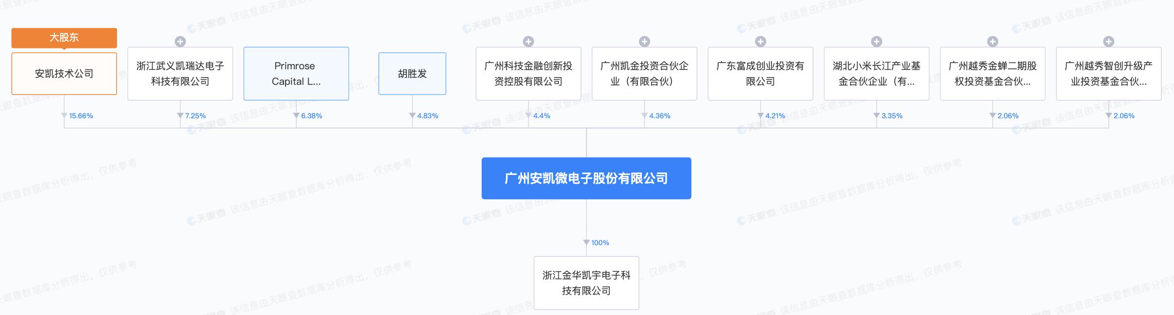 但在本次上市前,安凯微并无控股股东、实际控制人。据招股书介绍,安凯微前三大股东安凯技术、胡胜发(NORMAN SHENGFA HU)及其一致行动人和Primrose Capital分别持有该公司20.88%、19.06%和8.51%股份的表决权。