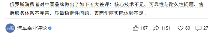 俄罗斯消费者对中国品牌做出了如下五大差评:核心技术不足、可靠性与耐久性问题、售后服务体系不完善、质量稳定性问题、表面华丽实际体验不足。
