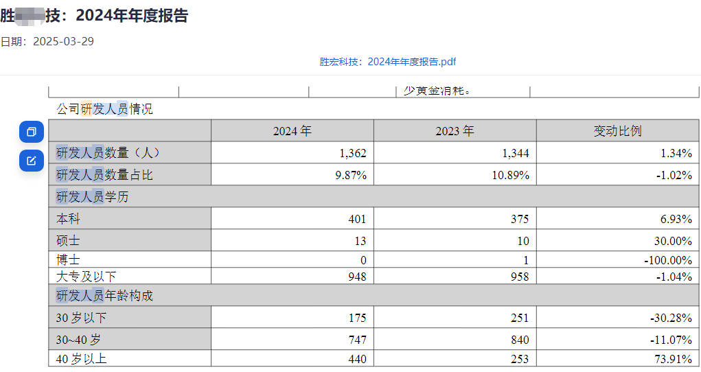 这是胜HK技2024年年报,研发人员学历情况。大专及以下占了近7成。