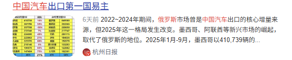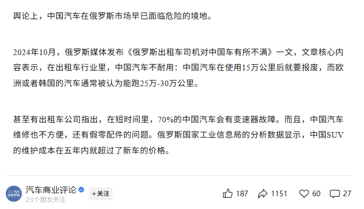 2024年10月,俄罗斯媒体发布《俄罗斯出租车司机对中国车有所不满》一文,文章核心内容表示,在出租车行业里,中国汽车不耐用:中国汽车在使用15万公里后就要报废,而欧洲或者韩国的汽车通常被认为能跑25万-30万公里。