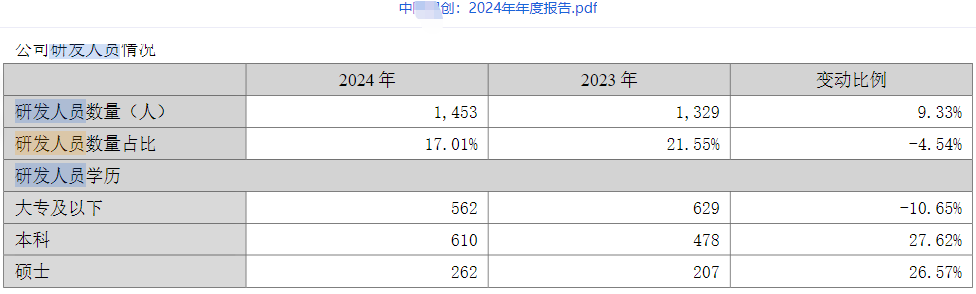 中JX创,2024年年报,研发人员中,大专及以下占了近4成,本科和大专及大专以下,构成研发人员主力。
