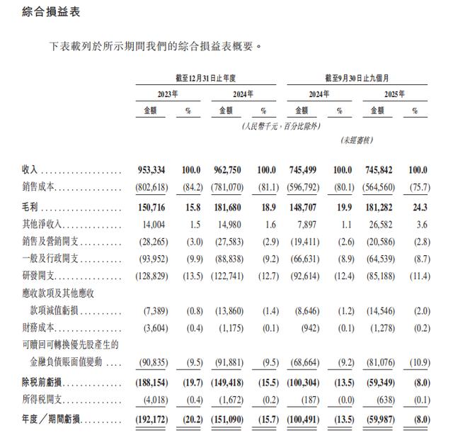 从利润表的合计结果看,除税前亏损占比在2023年、2024年、2024年前9个月、2025年前9个月分别为19.7%、15.5%、13.5%、8.0%,亏损收窄趋势与毛利率改善相互印证。但亏损收窄并不只来自经营层面的毛利与费用,一项需要单独看待的指标是可赎回可转换优先股相关的金融负债账面值变动,占比在2023年、2024年、2024年前9个月、2025年前9个月分别为9.5%、9.5%、9.2%、10.9%,这类项目会显著影响期间损益的可比性与经营性成果的呈现方式。三、亏损收窄之后,更关键的是盈利质量