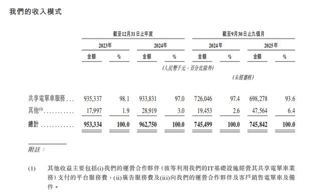 区域份额之外,另一个直接的业务看点来自收入构成。招股书披露,松果出行的共享电单车服务在2023年、2024年、2024年前9个月、2025年前9个月分别贡献98.1%、97.0%、97.4%、93.6%的收入,这组数字本身意味着经营重心仍然高度集中在单一收费场景,任何与骑行频次、客单价、城市准入等相关的波动,可能更容易直接反映到当期收入结构上。