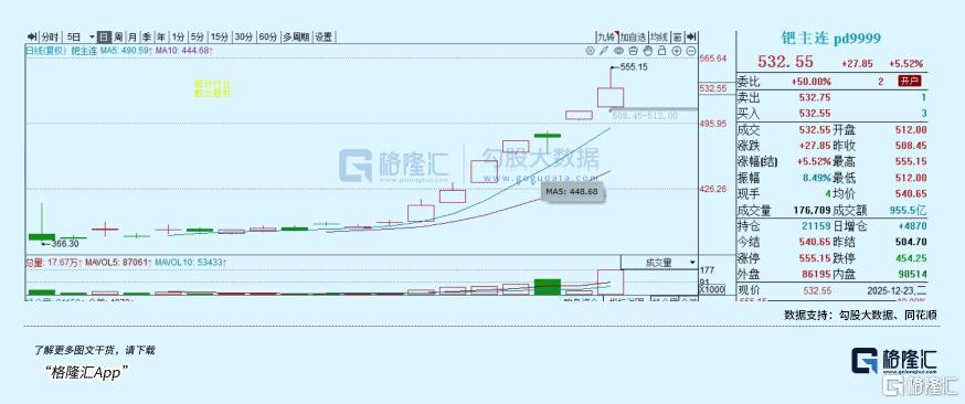 近期期货铂、钯涨势凌厉,12月以来持续爆发。广期所铂期货累计涨幅超40%,钯期货达43%,在昨日双双涨停后,今日铂期货继续涨停,钯期货大涨5%。